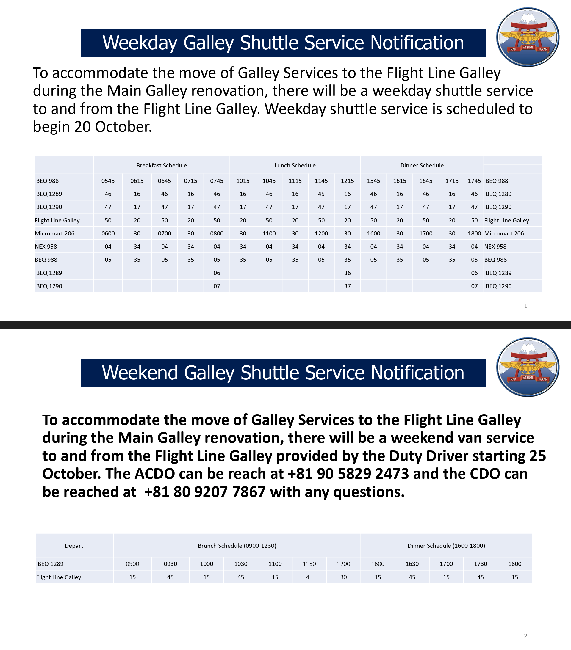 The NAF Atsugi Base Shuttle operates on a set time schedule Monday-Friday (except Federal Holidays). It is an easy and convenient way to travel across the base. The schedule changes depending on the time of year.