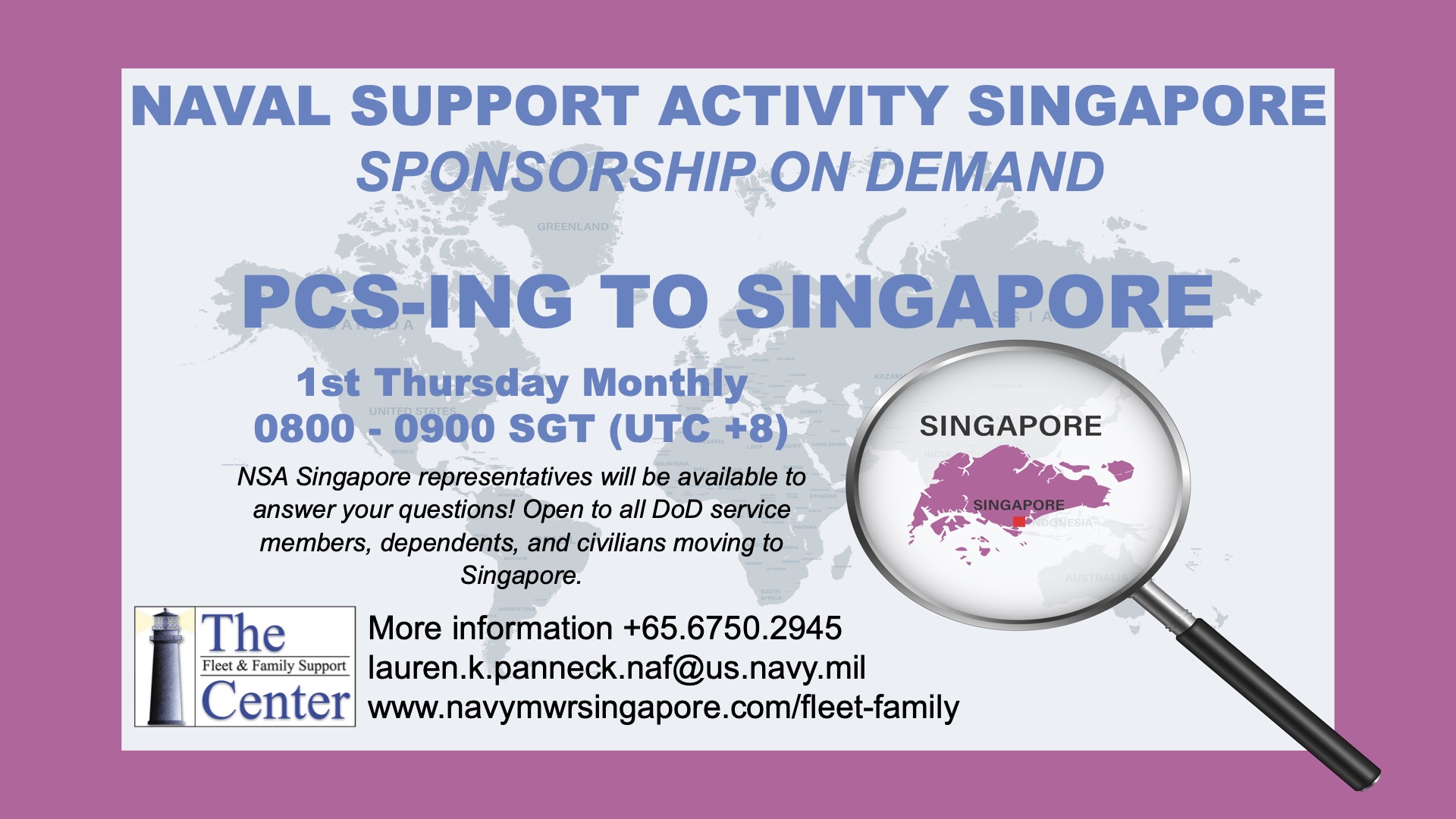 The NSA Singapore welcomes you to Singapore, the U.S. Navy's gateway to Southeast Asia.